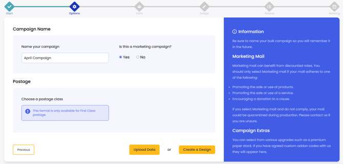 When you are setting up a new direct mail campaign you need to give the campaign a name. If you are setting up multiple campaigns it helps you easily find the campaign in the future, from your campaigns list.