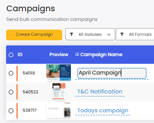 2) In your Campaigns list: Select 'Campaigns' from the left toggle menu, to view all of your campaigns in one table. Click on the campaign name to open the editing capability. This will auto save when you click away from this box.