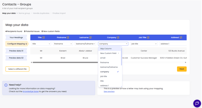 You can also skip any columns that are not relevant to your mailing. Deselect in the 'Your Headings' row or select 'Skip Column' in the drop down.