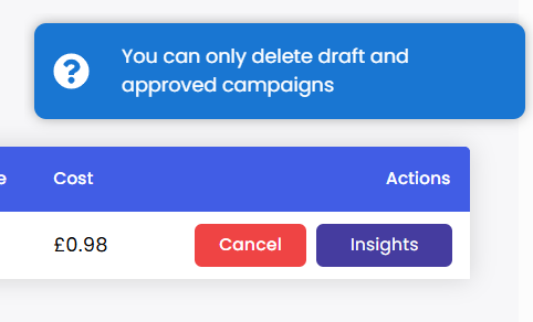 If you have scheduled a campaign, that has not yet been processed, you may still be able to cancel this. In the same 'Campaigns' list, a red 'Cancel' button will appear if this is possible. Once cancelled, you can then select and delete the campaign as above.