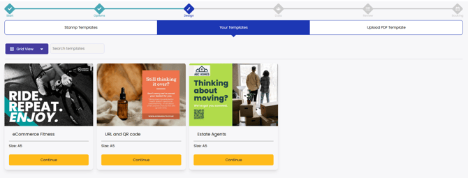 When you are creating a new direct mail campaign you have the same options to use a Stannp template (blank canvas or a fully editable Stannp template) or one of your pre-made templates.