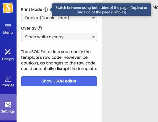 On our platform, you can freely change between Simplex and Duplex at any time. When designing your mail (in either the 'Designs' or 'Campaigns' area), click on the mail piece settings (highlighted on the left menu), and adjust the 'Print Mode' drop down to Simplex or Duplex.