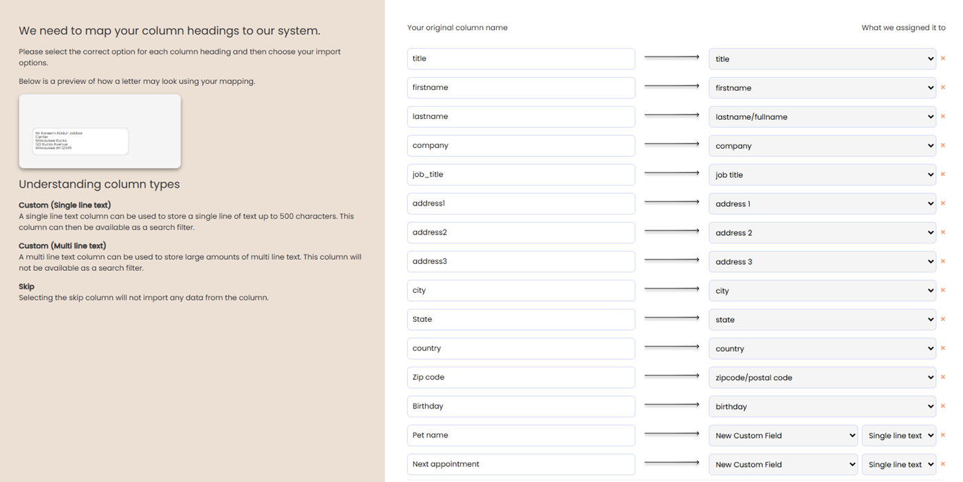 When uploading your mailing list to our platform, you can map columns headings of your mailing list with Stannp headings. Previously uploaded customer columns will map, if these are a match and new custom columns can be added.