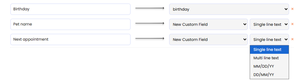 Select "New Custom Field" from the first drop down OR select an existing column heading if you want to map to this. Then select the column type from then second drop down.