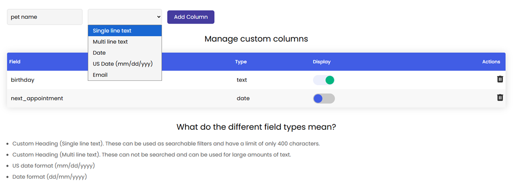 You can also manage your custom columns here. Toggle them on/ off and delete unwanted custom columns.