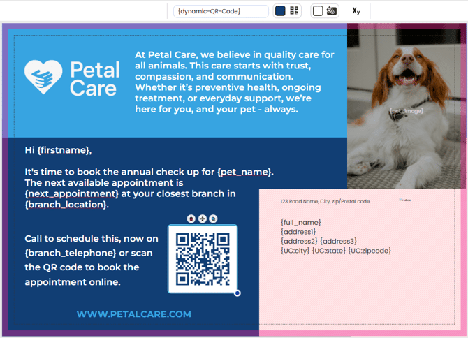 In this postcard example, text, image, and QR codes will all populate with recipient specific content.