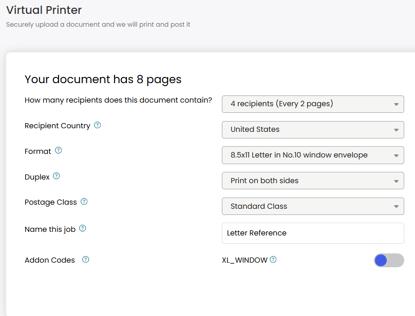 Confirm recipient number. The first important step is to select the number of recipients this document contains. For single recipient sends, this will remain at 1 recipient. If sending to multiple recipients, the options for consistent pages per recipient will be listed. This helps us define exactly how your document should be divided. Each Virtual Printer job can only send consistent page numbers to each recipient.